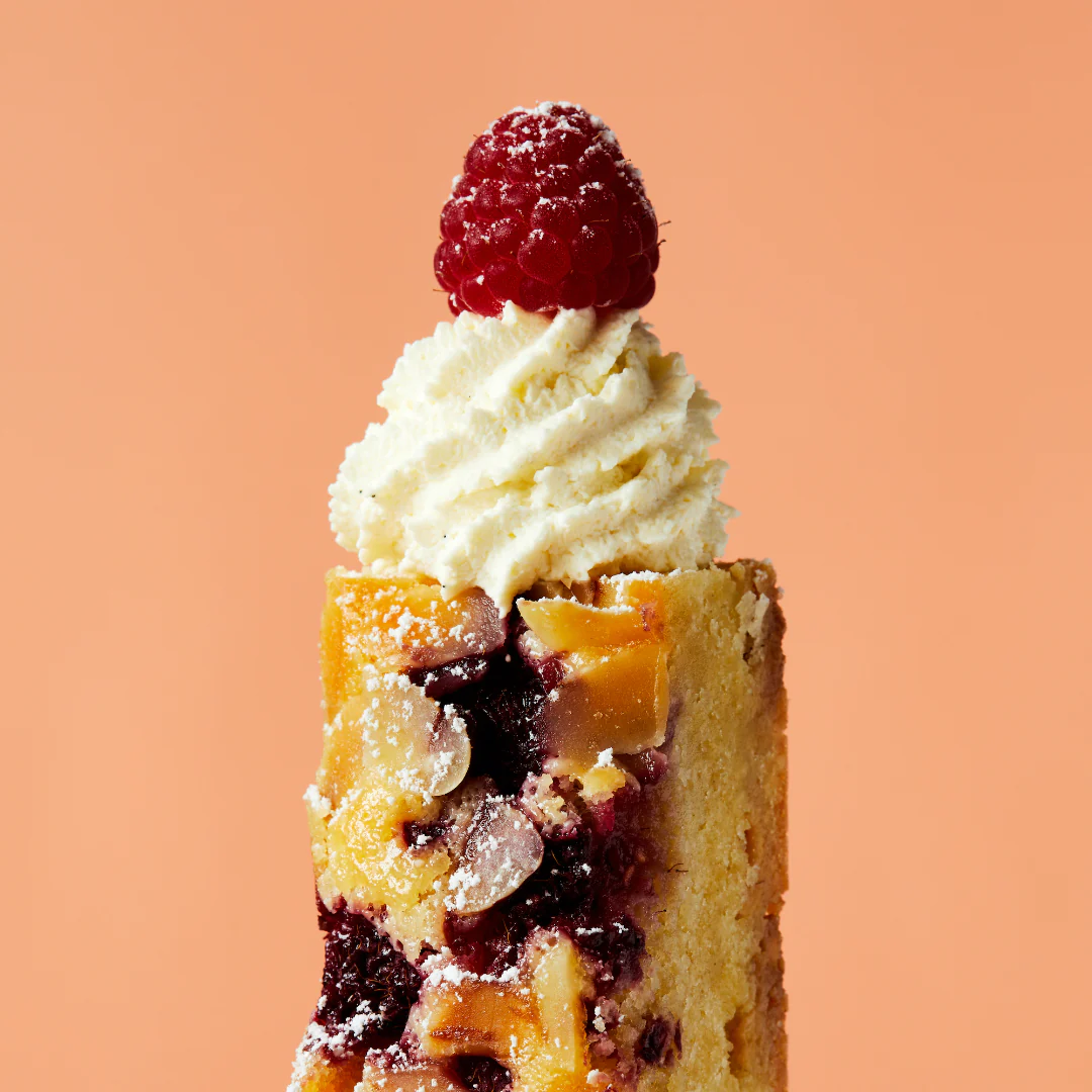 Elegant, indulgent, and bursting with flavour—our Raspberry & White Chocolate Frangipane Cake brings a buttery almond flour in a torrent of raspberries and white chocolate. This slice speaks with a French accent and if it could, would probably wear a raspberry beret. A recipe evolved from a Friand, with textures alternating between gooey and spongy. This effect is achieved by incorporating melted white chocolate and almond cream (Frangipane) into the recipe.