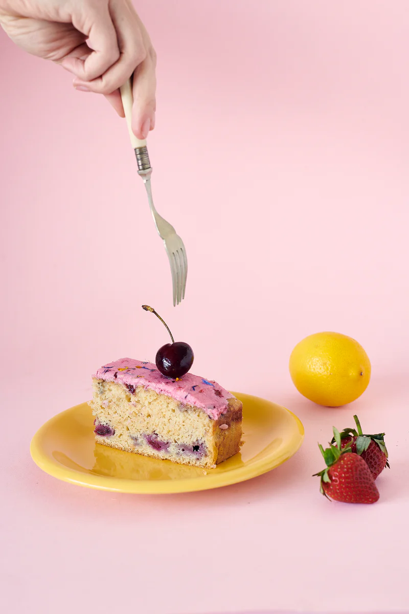 This is a delightful vegan sponge cake made with a mix of berries (Cherries, Redcurrants, Strawberries and Blueberries) and refreshing citrus fruit. Topped with pink, vegan icing that’s made with berry compote juices which gives the cake a striking yet natural colour. Finished with a sprinkling of dainty, edible flower petals.