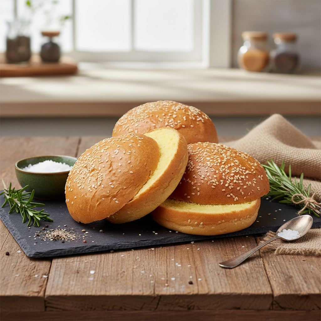 Elevate your burger game with our French Glazed Sesame Brioche Buns—sliced for convenience and sprinkled with toasted sesame seeds for added texture and flavour. These luxurious buns feature a rich, buttery crumb, a soft golden glaze, and a light sweetness that complements gourmet fillings perfectly. Ideal for premium burgers, grilled vegetables, or elevated sandwiches, they bring a refined, French-inspired touch to every bite.