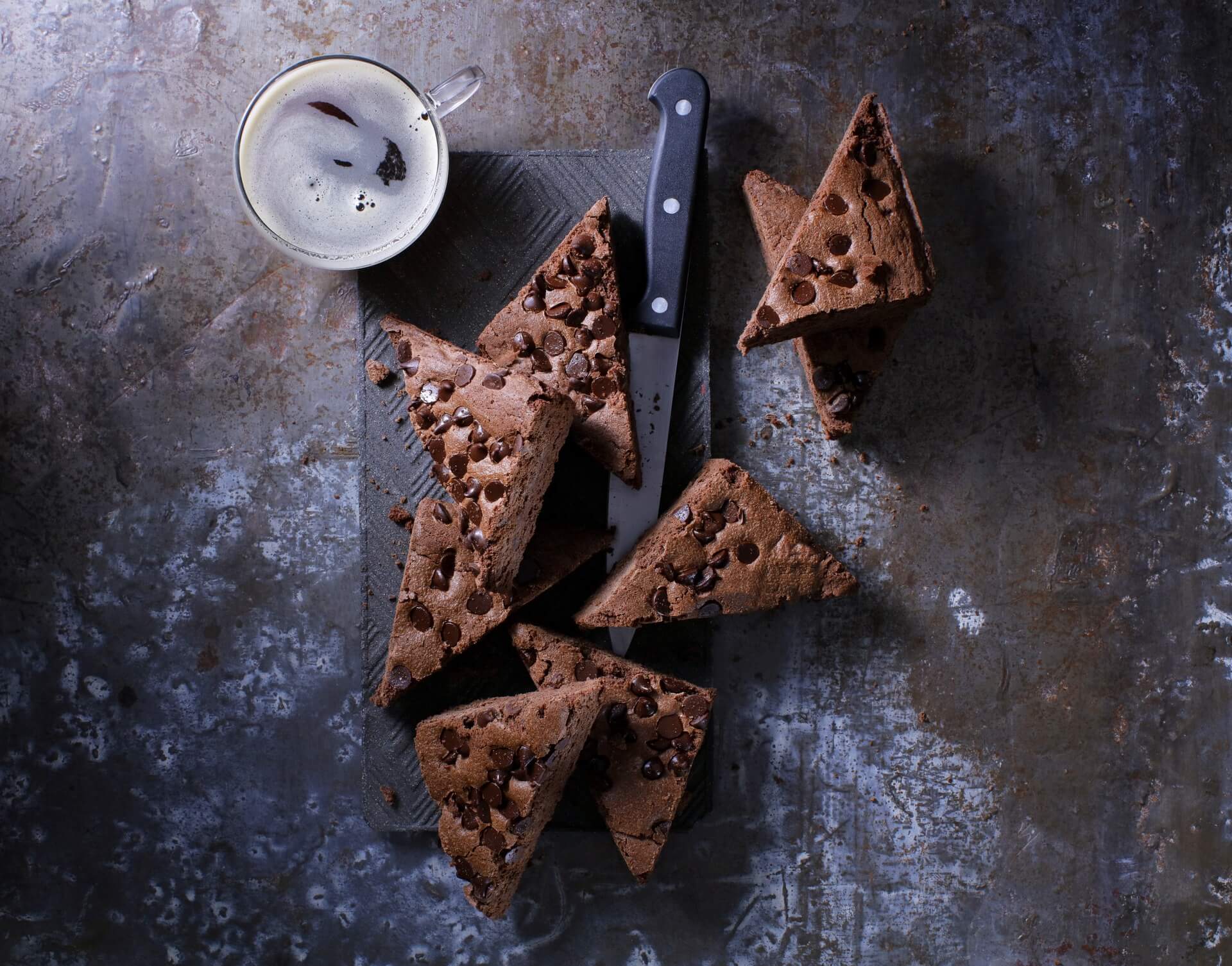 Topped with loads of dark chocolate chips for texture and bold flavour